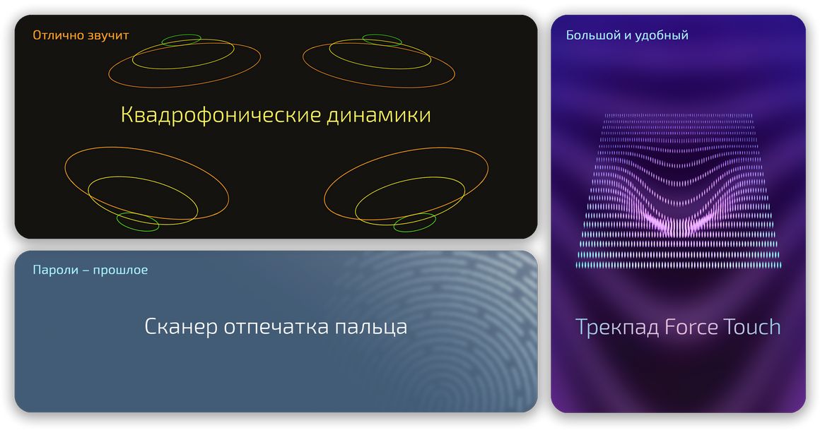 | Разъемы | 2 х Thunderbolt 4 (USB-C), MagSafe 3, mini-jack 3.5 мм |